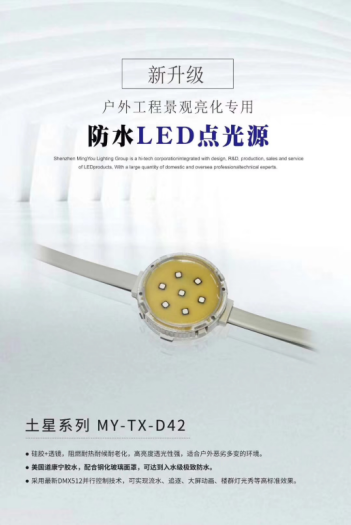 | 产品特性:一、防水:利用铝基板涂覆三防漆+硅胶无死角灌注,可达到入水级极致防水。 二:硅胶+透明PC罩,阻燃耐热耐候耐老化,防尘变抗紫外线,高亮度透光性强,适合户外恶劣多变的环境。 三:产品可配合底部按扣,方便安装拆卸,减少工作量。 四:采用最新DMX512并行控制技术,稳定可靠,功能卓越,可实现流水、追逐、大屏动画、楼群灯光秀等高标准效果。 | |