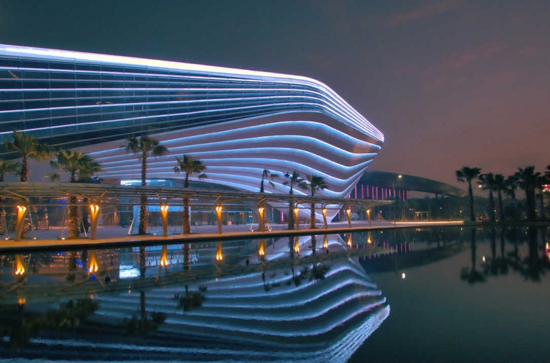 珠海国际会展中心位于珠海十字门中央商务区湾仔片区,与澳门相对而视,与香港遥望。当夜晚降临,线性的灯光将建筑的结构一条条勾勒出来,充满了现代感的建筑外观在灯光的照射下,阐述和深化了建筑物的特征和文化内涵,显现一种独特的形象特征和艺术美,感受到这座城市的温柔与包容。